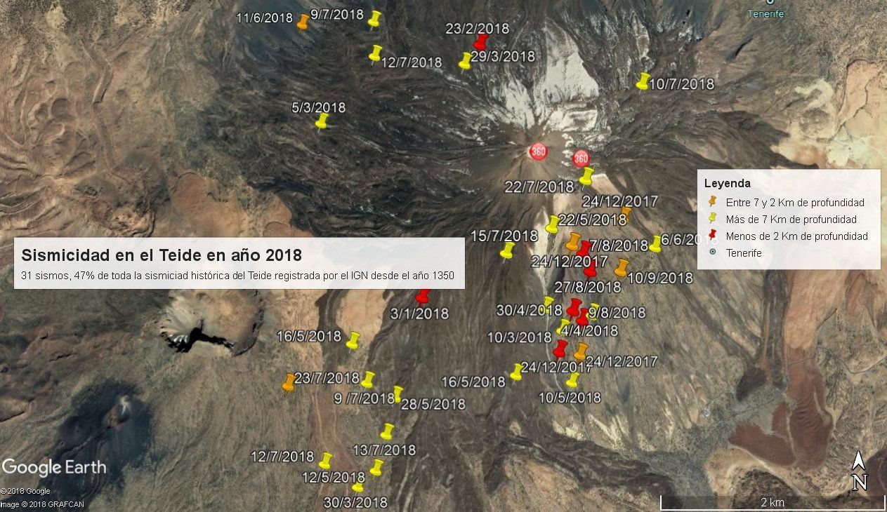 En la tarde de hoy 27 de agosto a las 16:20 h local canaria, un nuevo sismo de 1.4R a 1.700 mtrs de profundidad ha afectado al edificio vulcanológico del Teide, muy próximo a los otros dos eventos superfciales de los pasados días 7 y 9 de agosto, el área que delimitan los mismos tiene una superficie aproximada de 700X200 mtrs, a unos 250 mtrs del teleférico y paralelo a éste. Esto nos lleva a pensar, que el magma se está moviendo ya a niveles muy someros, lo cual concuerda con los eventos de largo período registrados desde el pasado día 17 de agosto.
